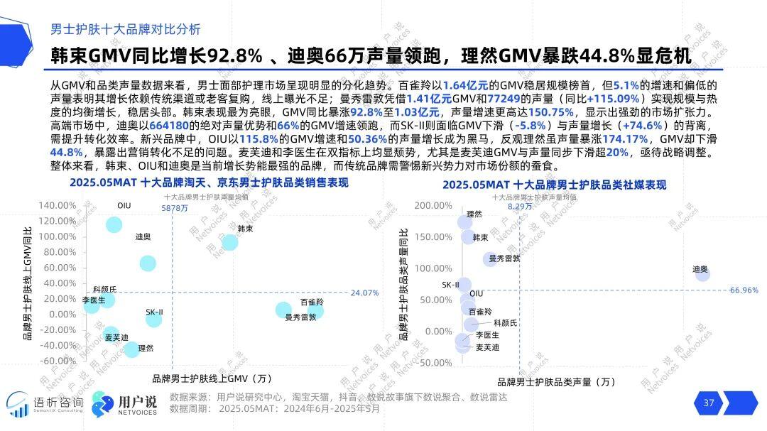 在用户说筛选的十大男士护肤品牌中,增长动能出现明显分化。老牌国货百雀羚虽以1.64亿GMV居规模榜首,但增速温和、声量偏低,暗示其线上曝光亟待加强。而韩束则展现出强劲势头,GMV同比暴涨92.8%,声量增速更高达150.75%,呈现出“量声齐飞”的健康增长态势。