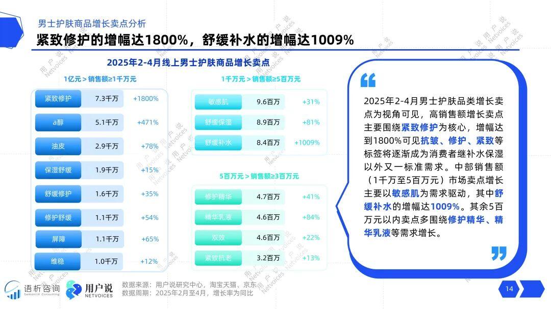 如果说清洁与保湿是男性护肤的1.0阶段,那么“功效进阶”已成为2.0时代的关键词。从销售数据来看,带有“紧致修护”标签的产品销售额增幅惊人,达到1800%,显示抗老、修护类需求正快速崛起,成为继基础保湿后的新增长驱动力。