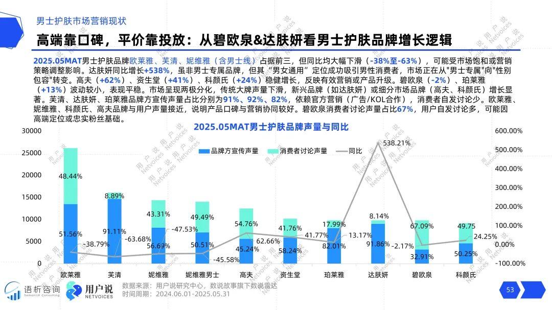 从品牌声量维度看,欧莱雅、芙清、妮维雅位列2025.05MAT声量前三,但三者声量同比均出现不同幅度下滑,或反映出头部品牌在内容传播上面临疲劳挑战。与之形成鲜明对比的是,达肤妍声量同比激增538%,尽管并非男士专属品牌,但其“男女通用”的定位成功吸引男性用户,也揭示出男士护肤市场正从“性别专属”向“功效共鸣”转变。