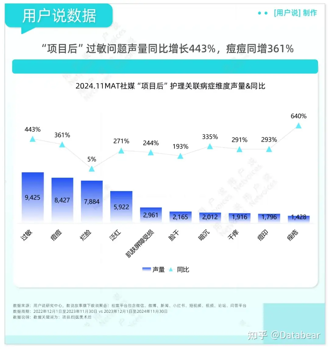 用户说数据监测发现,2024.11MAT期间,得益于医美消费者的增长,社媒平台中关于医美项目后的关联病症维度声量增速显著。其中,过敏、痘痘、烂脸、泛红为消费者主要热议话题,且痤疮、过敏、痘痘、暗沉等议题声量分别以640%、443%、361%、335%同比高速增长,反映出消费者对医美术后修复的高度关注以及阻碍该市场加速发展的关键因素。