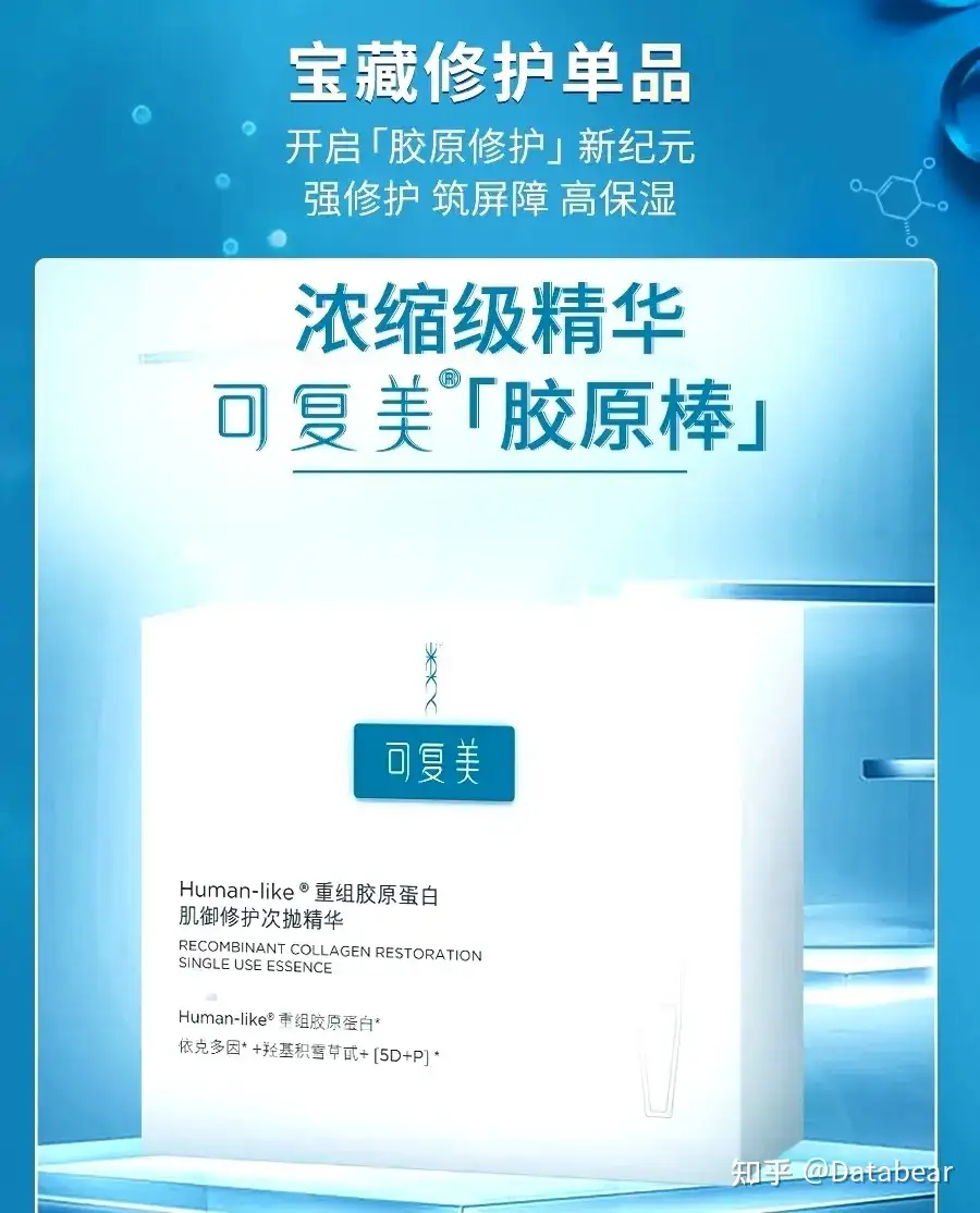 可复美则凭借专利技术开发重组胶原蛋白敷料产品,其“类人胶原蛋白敷料”深受市场认可。此外,品牌还成功推出面部精华产品——可复美Human-like重组胶原棒肌御修护次抛精华(即胶原棒),成为市场主力大单品,2023年预计收入占比将超品牌整体的三成,妆械协同战略的优势愈发显著。