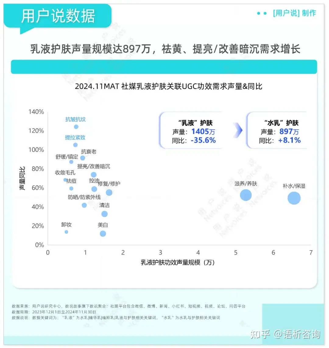 据用户说数据监测,2024年11月,虽然乳液护肤声量同比下滑,但抗皱抗纹、提拉紧致类乳液护肤需求UGC同比增长超过100%。另外,水乳护肤声量规模逆势增长,同比上升了8.1%。消费者对乳液功效护肤的需求仍在扩大,水乳套装逐渐受到青睐。