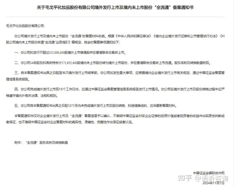 到了2024年4月,毛戈平向港交所递交了第四次IPO申请,不屈不挠地继续为其上市梦想努力。10月9日,因上市申请材料失效,重新递交上市招股说明书,第五次向IPO发起冲刺,并于11月7日终于拿到赴港上市备案通知书,拟发行不超过1.15亿股境外上市普通股在香港联合交易所上市,此时距离上市仅有一步之遥。