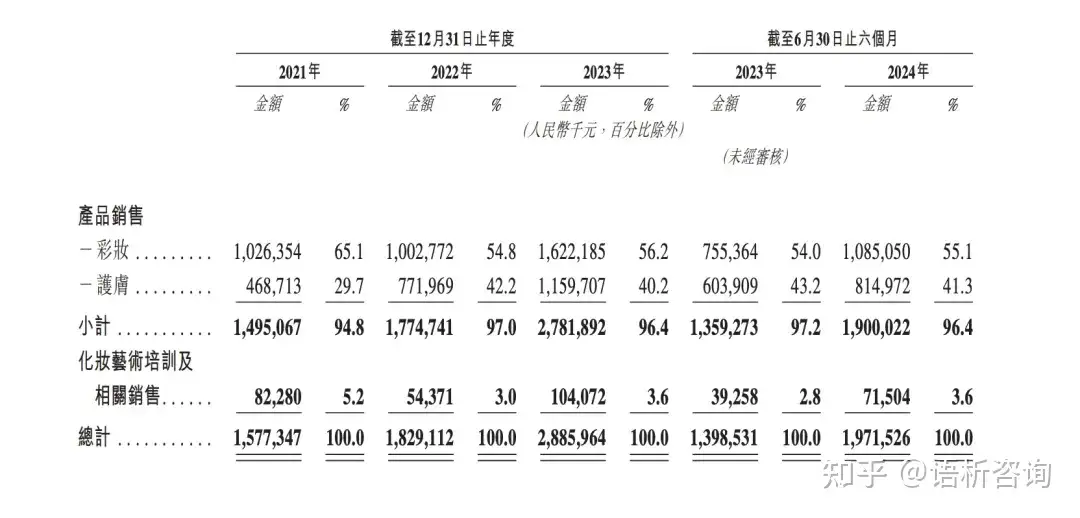 不过,尽管创始人毛戈平一直以“彩妆师”的身份活跃于大众视野,但发展至今,MAOGEPING毛戈平护肤和彩妆业务营收几乎势均力敌。数据显示,毛戈平护肤营收从2021年的4.69亿增长至2023年的11.60亿,年复合增长率高达57.3%,营收占比从29.7%扩张至40.2%;彩妆品类在去年营收也达到了16.2亿,占比为56.2%。