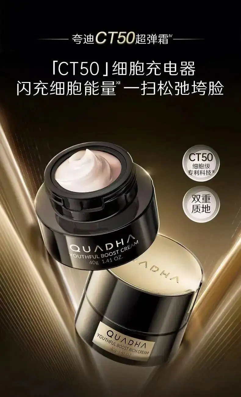 夸迪CT50动能支撑轻龄面霜借助CT50细胞级专利科技,为细胞闪充能量,深度修护肌肤衰老问题。其中茉莉花叶细胞、木槿树皮、星芒杉藻等成分,能放大线粒体能量,驱动细胞保持年轻;四重抗垮肽可撑起胶原网,收紧下颌线、塑紧轮廓;依克多因、神经酰胺、角鲨烷能加固表皮屏障,让肌肤更强韧。