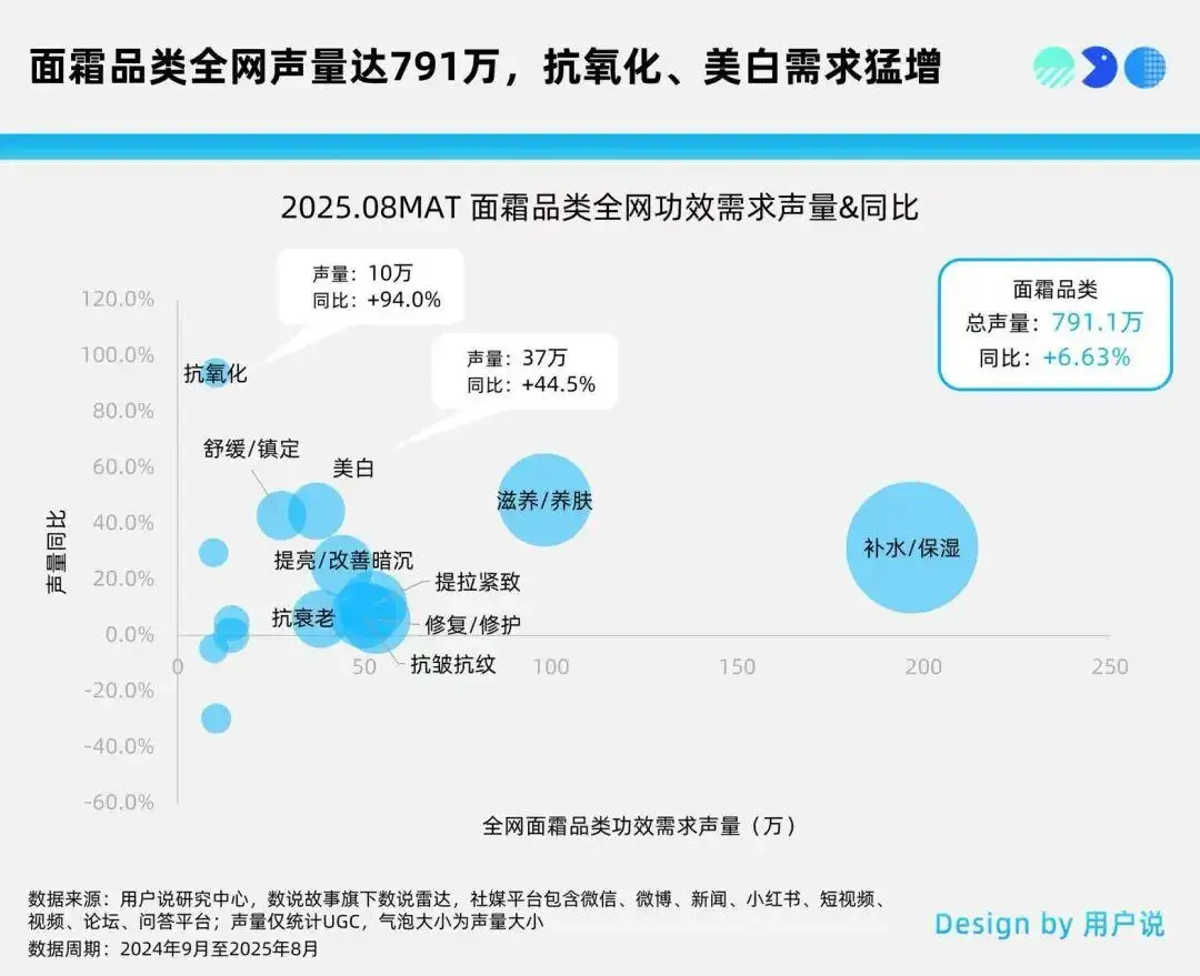 用户说数据显示,近一年的面霜品类全网总声量达791.1万,同比增长6.63%,市场关注度有所提升。其中,补水/保湿是最核心的功效需求,声量最大;而抗氧化、美白的需求增长尤为迅猛,抗氧化声量同比增幅达94.0%,美白也有44.5%的同比增长。这表明消费者在基础保湿之外,对肌肤抗氧化防护和美白提亮的重视程度大幅提升,这类功效的面霜或更受市场青睐