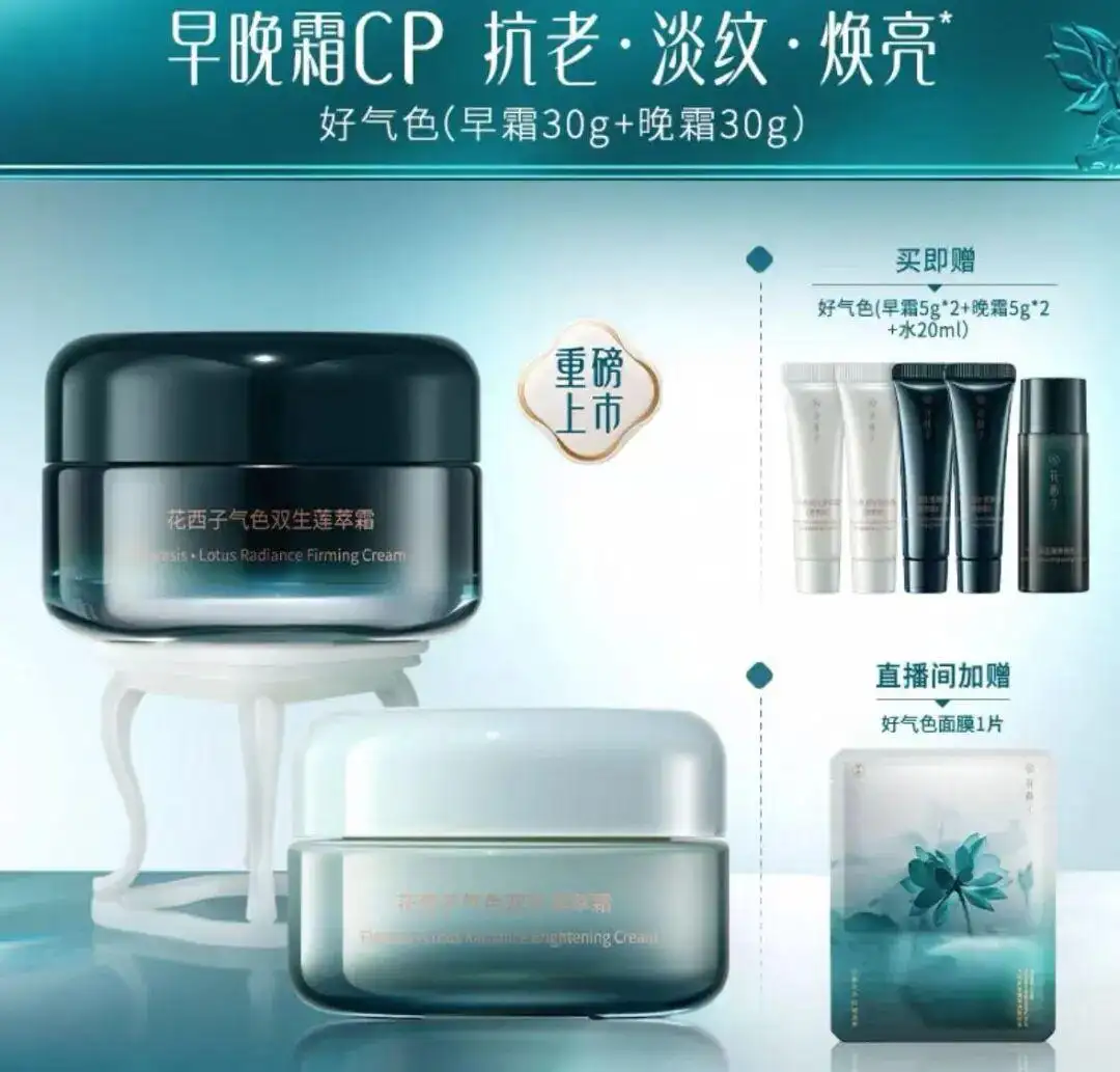 花西子气色双生莲萃霜分为早霜和晚霜,早霜可修护光损伤、淡化细纹;晚霜能紧致轮廓、淡纹抗皱,二者核心都依靠专研莲花胶原肽发挥作用。该成分促生Ⅰ、Ⅳ、Ⅲ、ⅩⅥ、Ⅶ型5大关键胶原;超分子气色丹指将芍药、药用黄精根茎/根、赤芝、膜荚黄芪根等七种植物植物提取物,通过超分子包裹技术提升其渗透性,达到焕亮肌肤的效果。