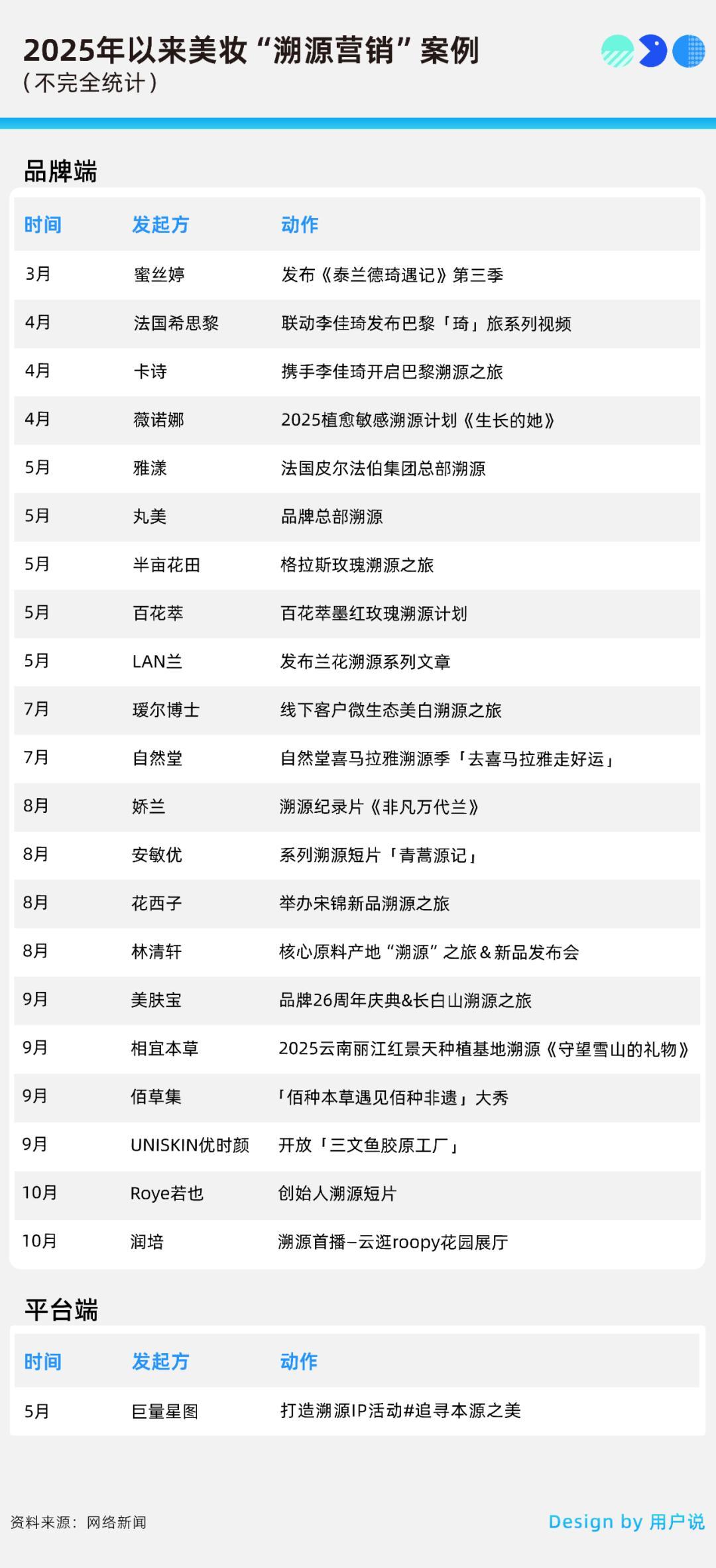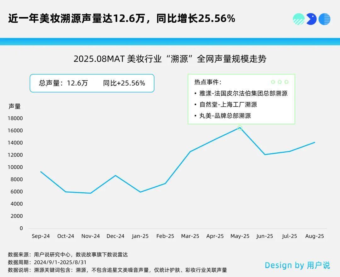 用户说数据显示,近一年全网线上“美妆溯源”相关声量达12.6万,同比增长25.56%,其中2025年5月雅漾、自然堂、丸美等品牌的溯源营销热度最高。