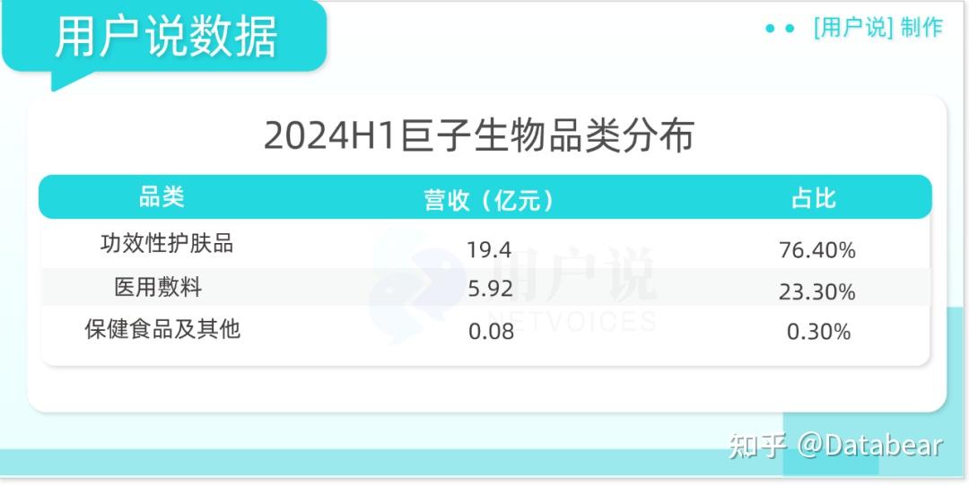 目前巨子生物的业务布局,主要涵盖功效性护肤品、医用敷料和保健食品等,其中涵盖功效性护肤品和医用敷料的专业皮肤护理产品板块,撑起了巨子生物的绝大部分营收。而以医用敷料起家的巨子生物,功效性护肤品的营收实际上已远超医用敷料。据最新财报显示,今年上半年巨子生物的功效性护肤品同比增长62.1%,以19.4亿元的收入,占主营业务比例76.4%。医用敷料总收入增长为5.92亿元,但占主营业务比例仍在持续下滑,为23.3%。