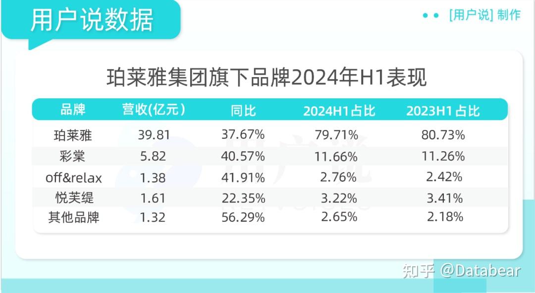 主品牌珀莱雅和新品牌彩棠几乎代表了珀莱雅集团,珀莱雅在大单品策略下,通过打造爆款产品,如红宝石精华系列等,实现品牌升级和市场突破。这些产品在性价比和功效上与国际大牌竞争,成功吸引了消费者。2024年上半年,珀莱雅单品牌营收达39.81亿元,同比增长37.67%,在总营收中贡献了近八成收入(占比79.71%)。彩棠营业收入5.82亿元,同比增长40.57%,上升态势明显。Off&Relax(OR)、悦芙媞的营业收入分别同比增长41.91%、22.35%