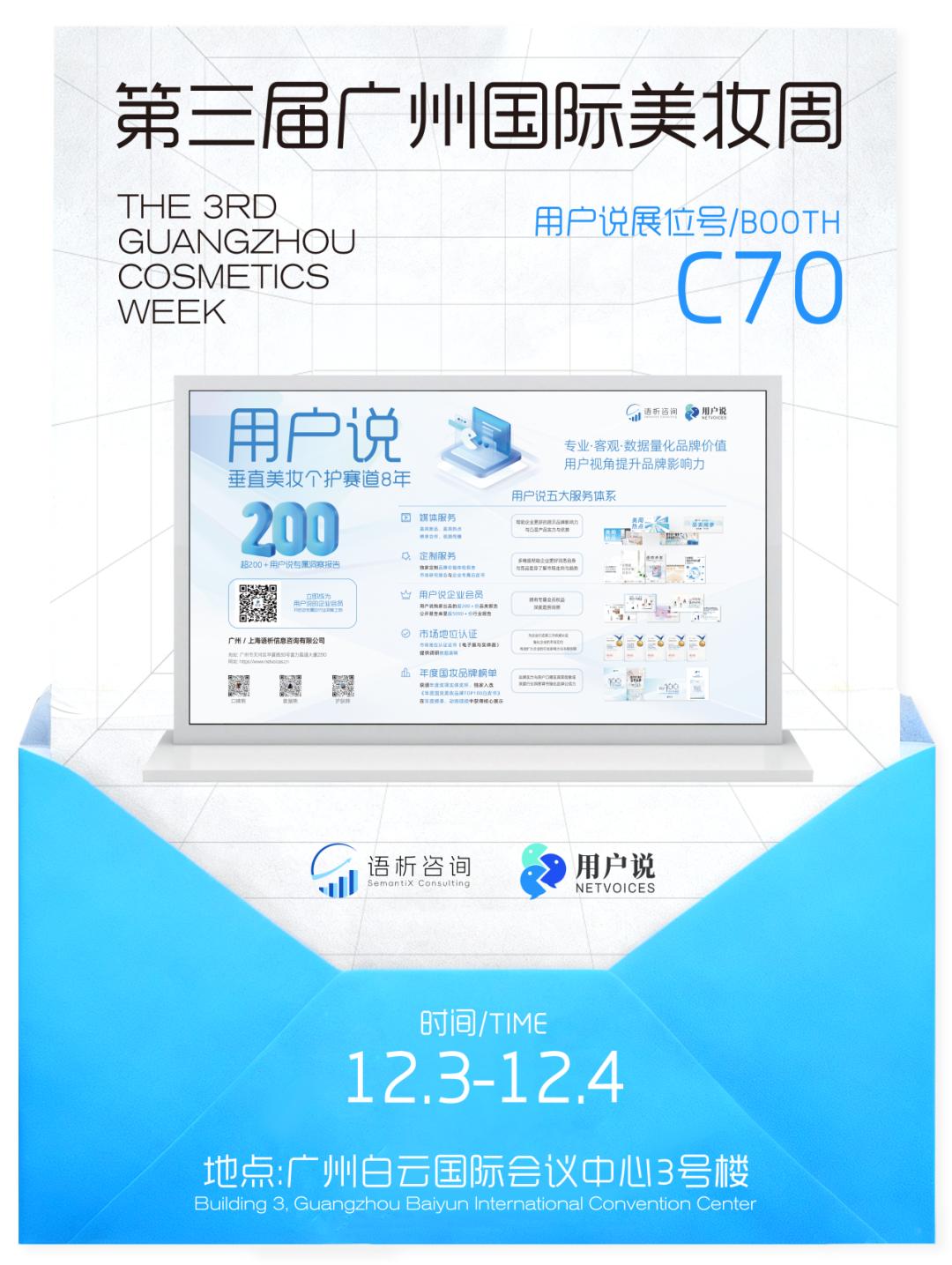 12月3日-4日,专业干货、精准数据、深度对接尽在C70展位,用户说将带来最新行业报告及市场洞察成果,期待与您面对面交流,用数据赋能品牌增长,共绘美妆行业发展新蓝图。