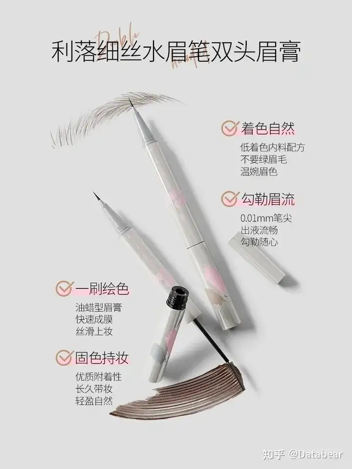 除了底妆、口红,眼妆方面也出现了能一品多用的【唯资利落细丝水眉笔】,塑描一体,一笔双头。一头是水眉笔,可以绘制精致毛流感,立体如生;一头是染眉膏,轻轻一刷精准上色。另外,水眉笔不仅可以勾勒毛流,也可以可描绘卧蚕阴影,点画气氛雀斑,勾勒眼睑下至,延长双眼皮轮廓。