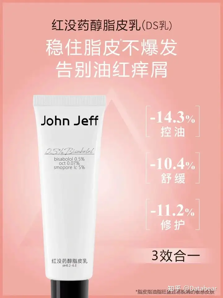 主打配方精简与高效的John Jeff推出【红没药醇脂皮乳(DS乳)】,针对脂皮肌肤问题——油腻/泛红/瘙痒/脱屑,添加专利成分5%珈妍净,多通路维稳脂皮,根源控油+2重平衡微生态+4重舒缓+3重修护;无油配方,不添加植物油、合成油酯、矿物油,脂皮使用0负担;脂皮爆发期及稳定期都适用,可日常长期使用。