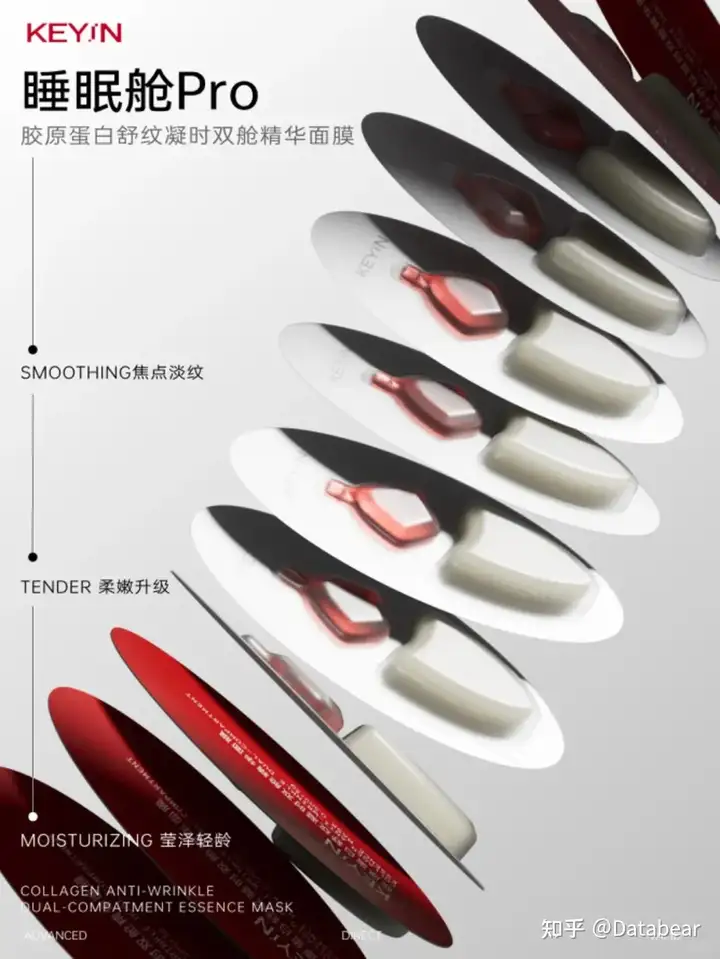 另外,也有品牌从产品功效的角度出发,以包装推进功效复合。【KEY iN睡眠舱Pro】,全新开启「双舱模式」,从包装上分为两个舱:淡纹舱-雾感精华,高速平纹;嫩肤舱-细腻乳霜,整夜灌注。淡纹舱精华点涂在眼尾、额头、眉间等容易产生褶皱的部位按摩吸收,嫩肤舱面膜均匀涂抹全脸,着重按摩法令纹、泪沟等易凹陷部位。分舱护理,不同功效,带来高效专业的护肤体验。