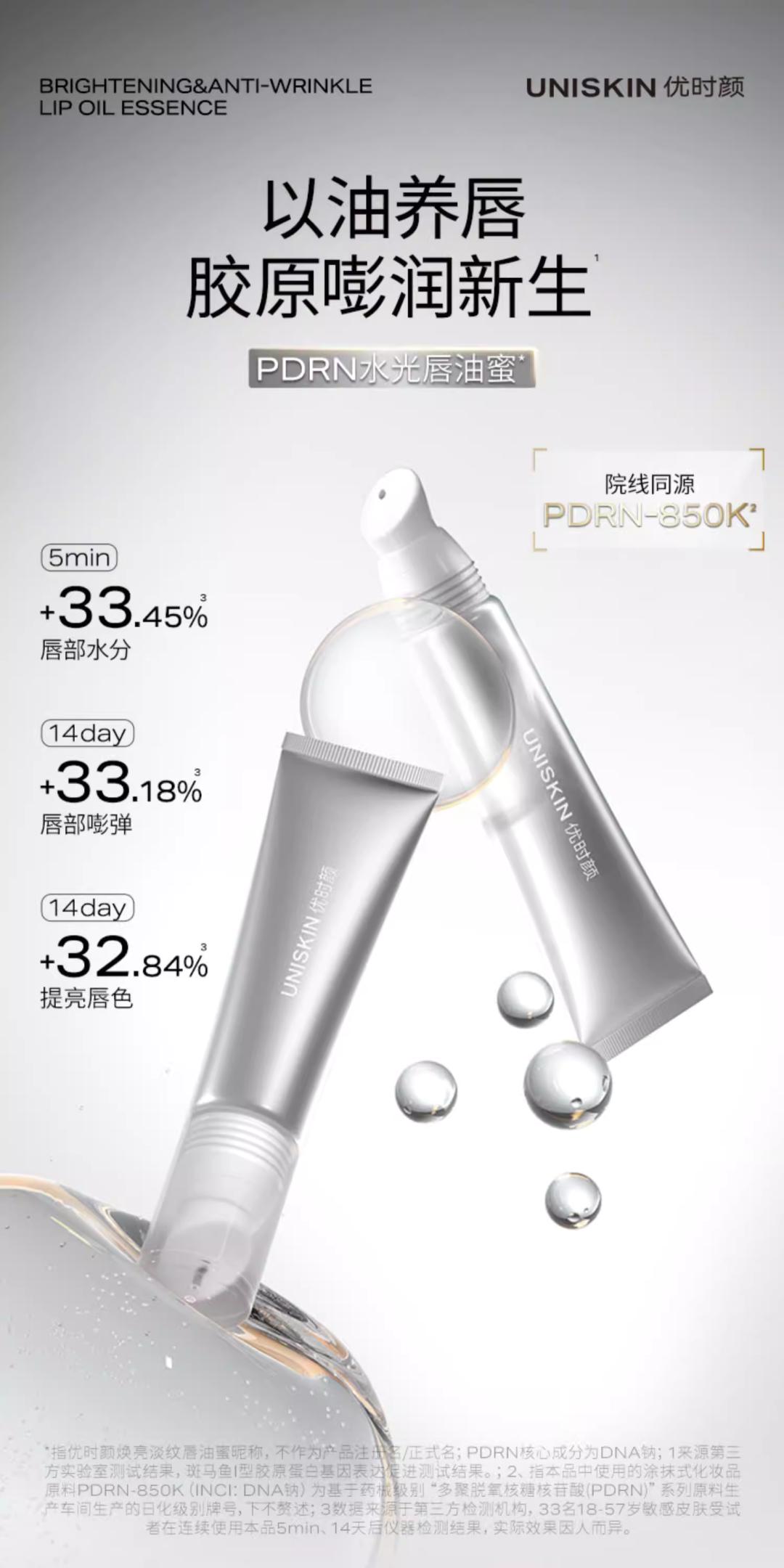 优时颜此款唇部产品的研发特色在于将生物修护成分PDRN精准适配于唇部这一特殊肤质。其采用的院线同源PDRN-850K,强调特定的分子量(850K道尔顿),可能旨在优化其在唇部薄嫩肌肤的渗透性与生物活性。