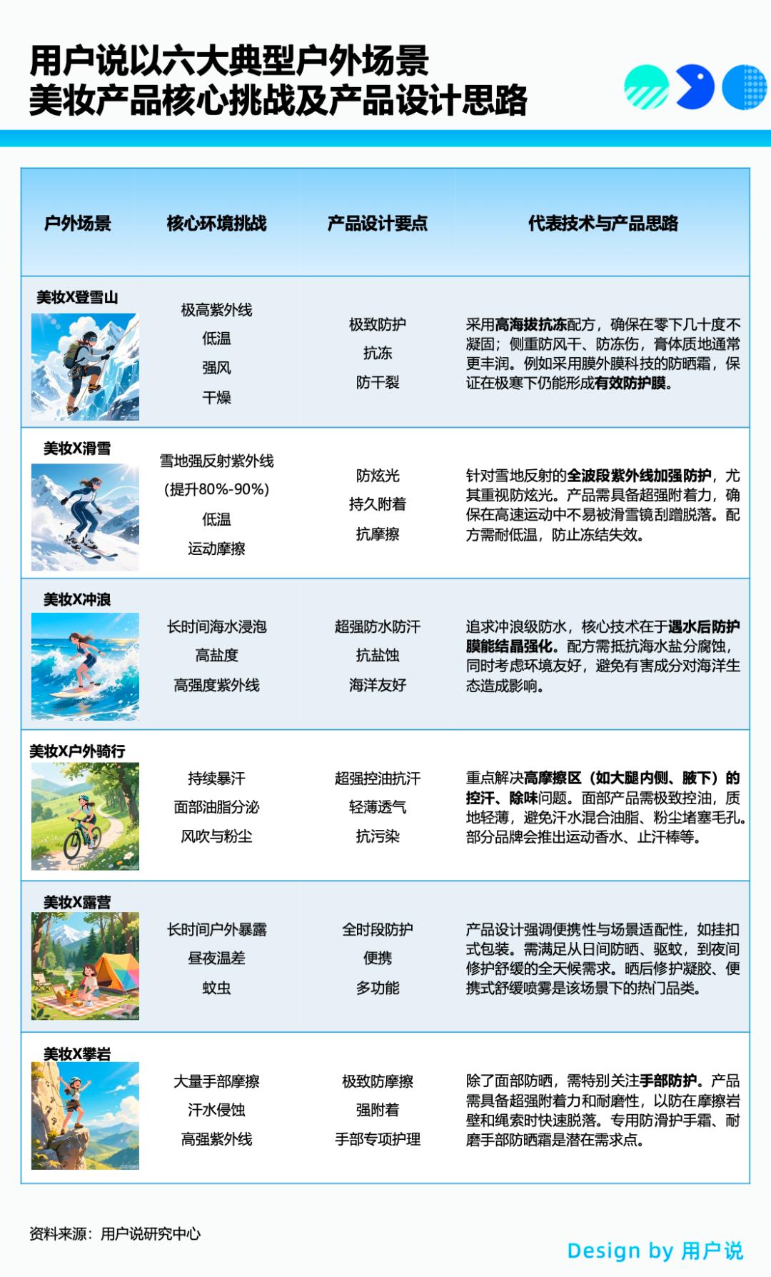 从产品角度来看,关键在于针对特定场景的痛点进行技术突破。首先,配方与质地需因地制宜:针对雪山极寒环境,配方应避免冻结;而针对冲浪场景,则需开发遇水后膜力更强的“智能”成膜技术。