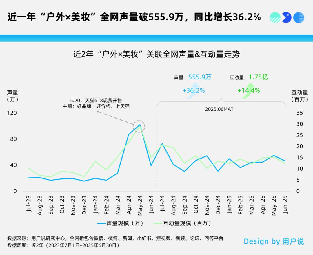 用户说今年7月发布的《狂抢运动美妆赛道?跨界成增长新引擎?》文章显示,在2025.06MAT期间,全网“户外+美妆”的声量已飙升至555.9万,同比增长36.2%,相关话题全网的互动量已达1.75亿。