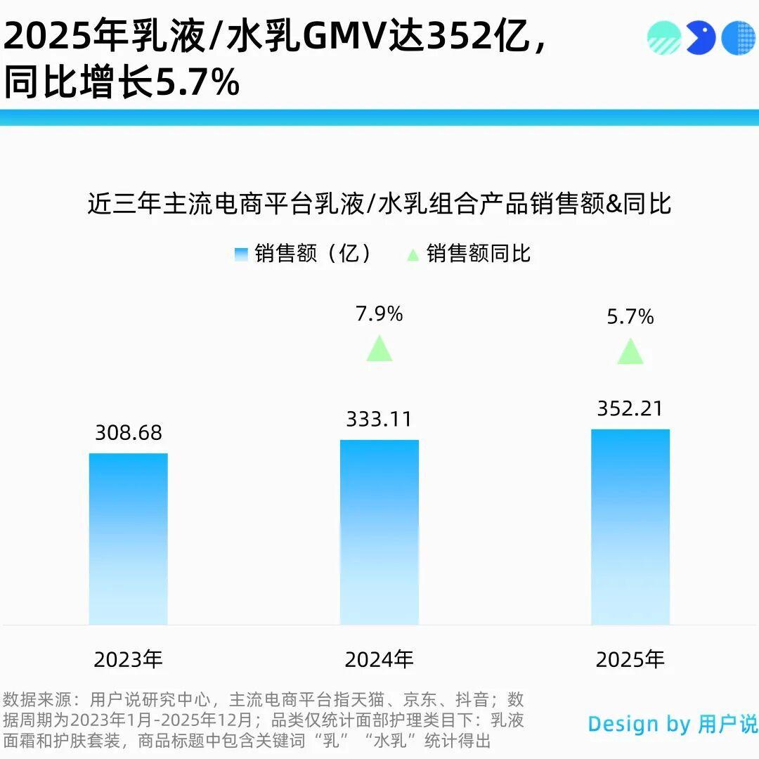 据用户说研究中心数据,2025年乳液品类在主流电商平台的全年销售额达到352.21亿元,同比增长5.7%。如果把近三年的走势放在一起看,乳液仍然保持着相对稳健的增长。