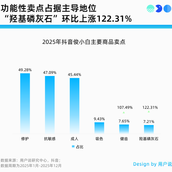观察俊小白2025年在抖音上的热销商品,也可发现牙膏基本包揽了所有的销售额,占比高达91.66%。其中“修护”“抗敏感”是最显著的两个卖点,分别占据销售额的49.28%、47.09%,且“羟基磷灰石”卖点增速明显,环比上涨达122.31%。