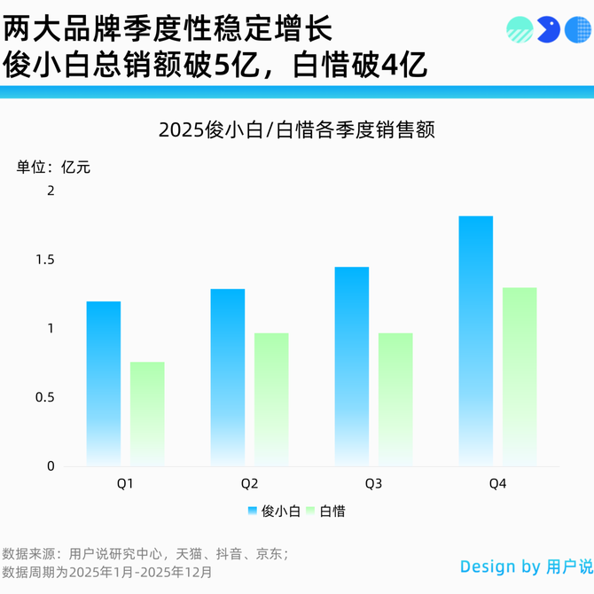 其中,白惜和俊小白两大新锐品牌皆在短时间内跑出了瞩目的成绩。用户说数据显示,2025年白惜和俊小白两大品牌线上销售额都达亿级以上,其中俊小白销售额破5.76亿,白惜破4亿。