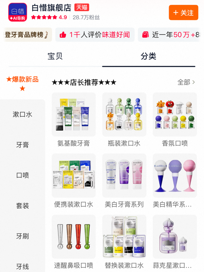 对于白惜,则可以借鉴俊小白的科研叙事,把“抗糖”概念提升至公共健康高度,建立专业权威感。并且利用好“感官体验”优势,无论是漱口水还是牙膏,都遵循统一标准,让体验一致性成为品牌识别的一部分。