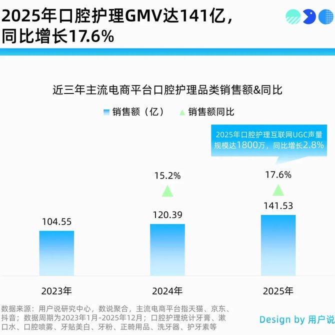 这种趋势同样体现到中国市场中。随着国民生活水平的提升和健康意识的增强,消费者愿意在口腔健康管理上投入更多关注度。用户说数据显示,2025年国内口腔护理GMV已达141亿,同比增长17.6%,声量也飞速增长至1800万。