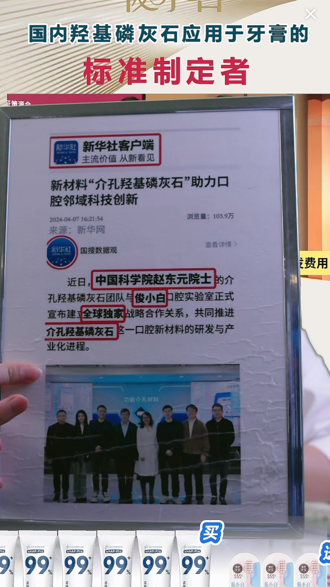 功效型产品的背后离不开技术的支持。据俊小白官方介绍,其牙膏产品中所使用的「介孔羟基磷灰石」,由品牌与复旦大学的中国科学院院士赵东元介孔羟基磷灰石团队合作研发,该材料经介孔技术处理后,能自然融入口腔环境,减少过敏风险,从根源上修护牙釉质屏障,维持牙龈和牙周健康。