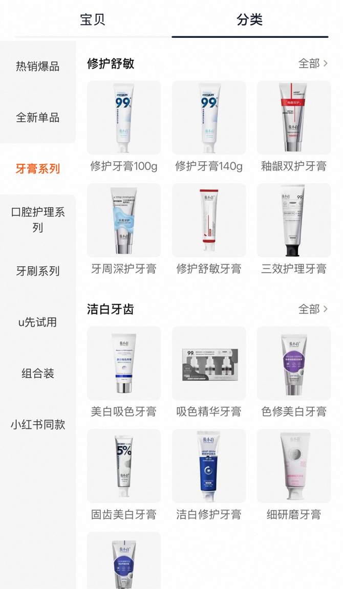 围绕「介孔羟基磷灰石」,俊小白推出亮皓密集修护牙膏、釉龈双护专健牙膏、修护舒敏牙膏等多款功能性牙膏,搭建出配置品牌核心技术的牙膏产品矩阵。