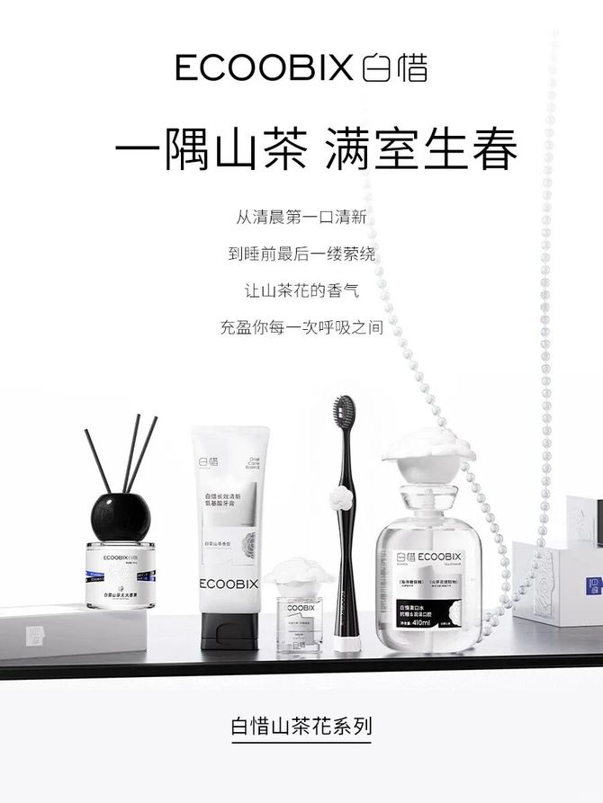 围绕着“抗糖”理念,白惜还推出了抗糖牙膏、抗糖口喷,并且延伸出牙刷、牙线、牙齿美白精华等品类,逐步构建出完整的口腔护理产品矩阵。在今年3月份,品牌还推出「白雾山茶无火香薰」,与牙膏、口喷、漱口水、牙刷共同组成「山茶花系列」,充分凸显其扩张野心。