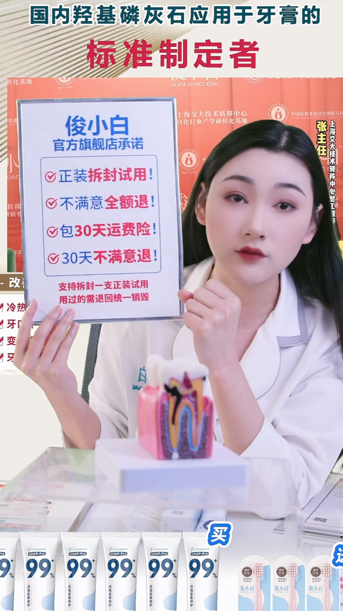 先来看俊小白。在创立之初,品牌创始人就表达过“年方八十,牙有二十”的使命,即“80岁的老人至少拥有20颗功能牙”,这就对产品提出了极高的要求。所以尽管俊小白创立之初锚定的是牙膏品类,但并没有投身简单的清洁型牙膏,而是转向开发羟基磷灰石牙膏,精准填补了当时的市场空白。