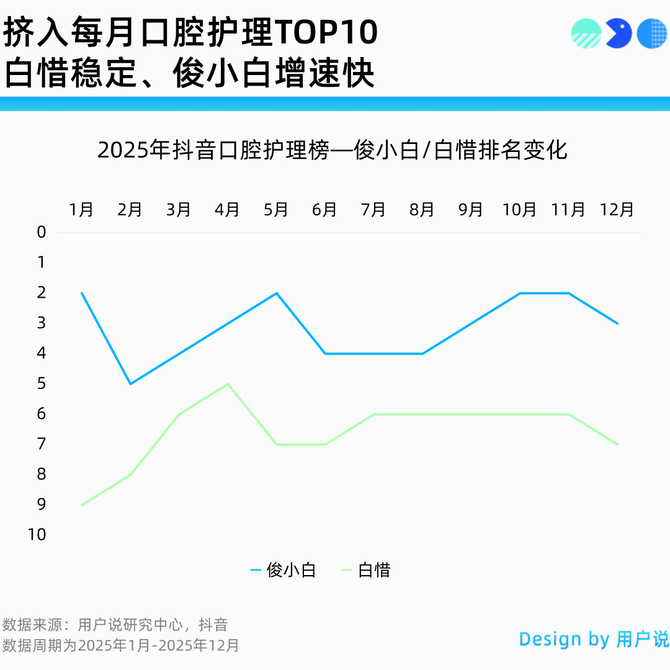 抖音数据显示,在2025年,俊小白每月销售额都稳定在2500万以上,最高时达到了接近1亿的规模。白惜同样稳定在2500万以上,且截至当年618大促的近3个月GMV实现破亿。就在上个月(2026年2月),两大品牌皆进入了抖音口腔护理TOP5榜单中,超越好来、云南白药、冷酸灵等大众品牌。