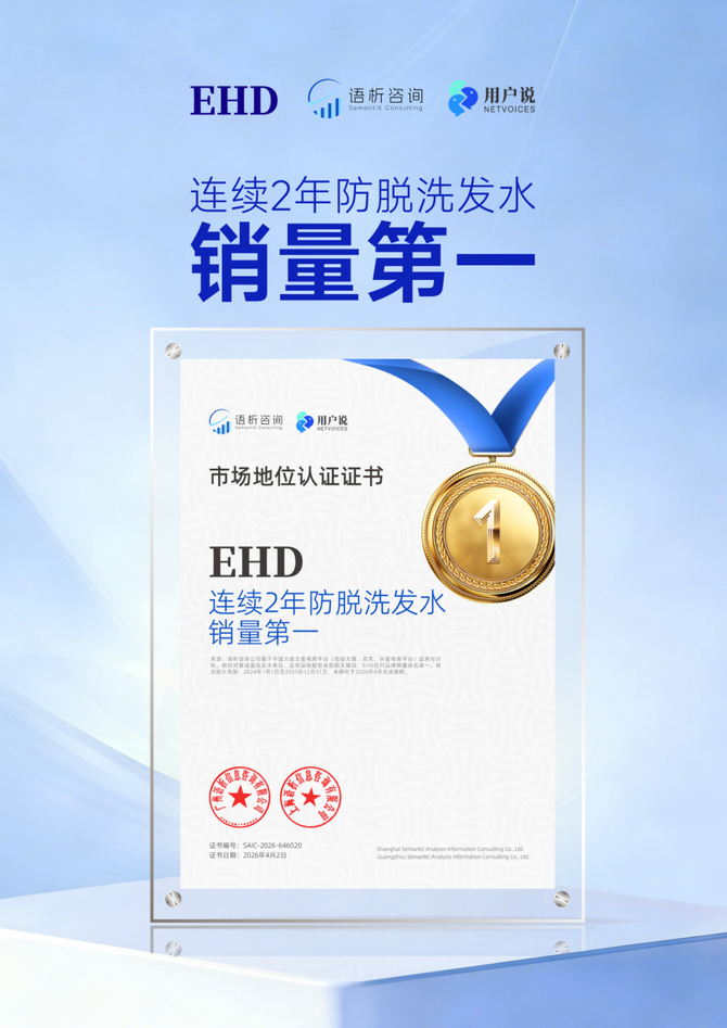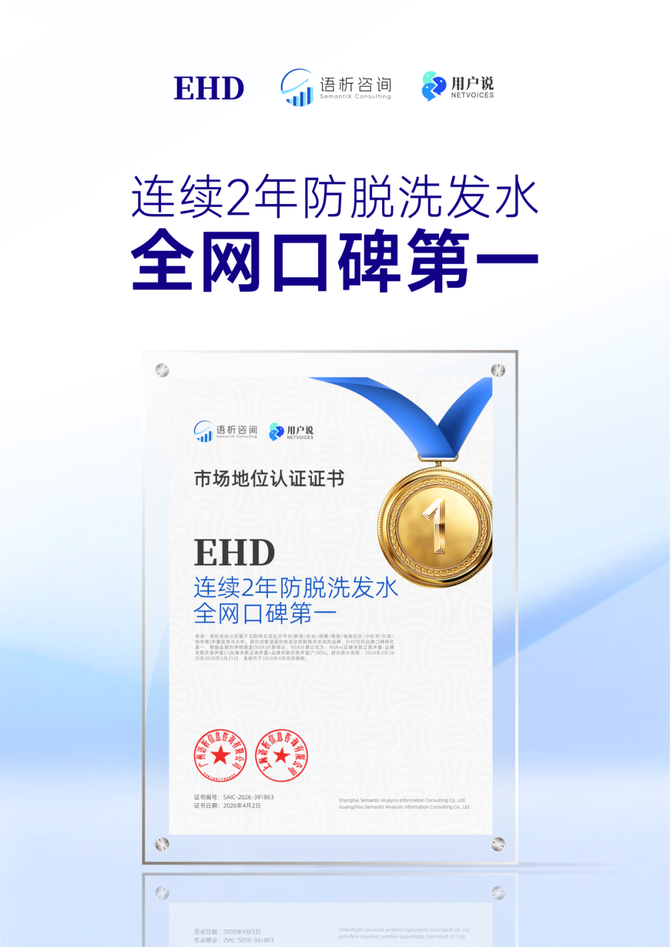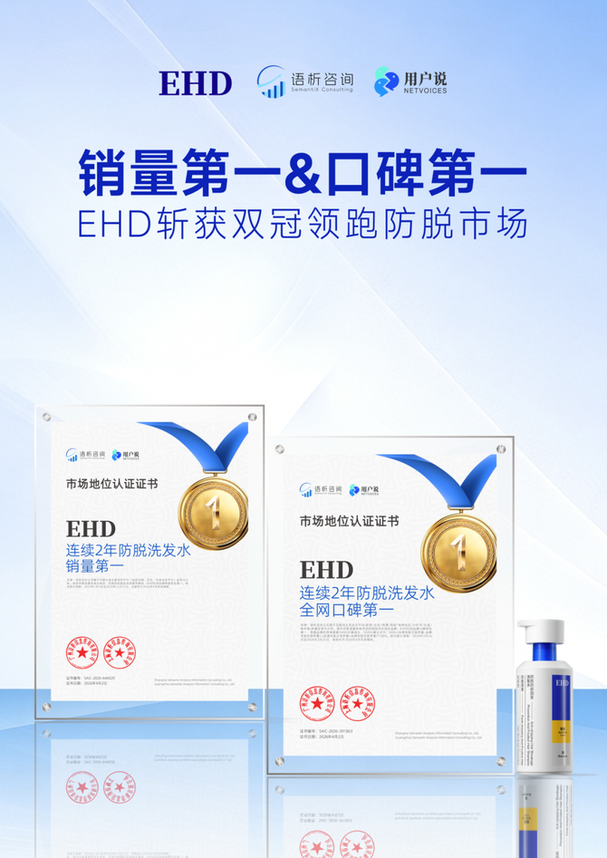 凭借卓越的科研实力,以及可验证的销售、口碑实绩,EHD斩获用户说&语析咨询“连续2年防脱洗发水销量第一”“连续2年防脱洗发水全网口碑第一”两大权威认证,展现出强大的市场领跑能力。