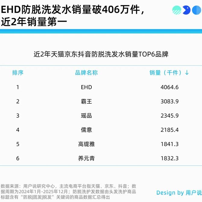 凭借断层领跑的销量成绩,EHD超越霸王、瑶品、儒意等品牌,拿下“连续2年防脱洗发水销量第一”。