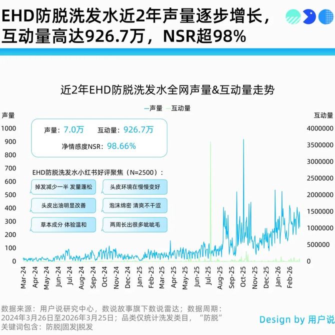 用户说基于互联网主流社交平台进行声量监测与分析,以所有涉及防脱相关功效的品牌为研究对象,发现近两年线上EHD声量高达7.0万,互动量为927.3万,且以98.66%的净情感度(NSR)超越施华蔻、欧莱雅等品牌,一举夺下“连续2年防脱洗发水全网口碑第一”。
