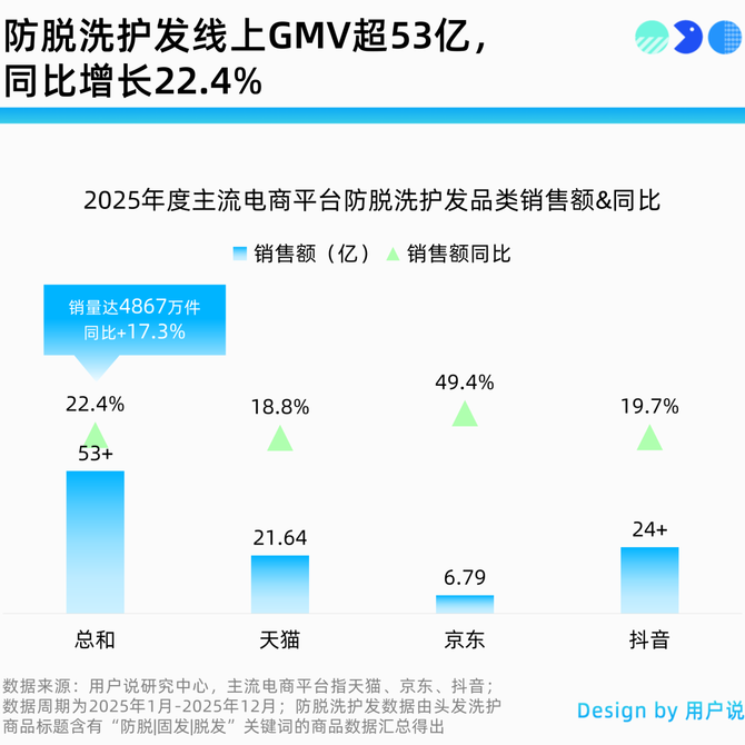 这背后是现代人日益加剧的“脱发危机”——脱发困扰早已成为普遍的大众化问题。用户说数据显示,2025年国内防脱洗护发线上GMV已超53亿,同比增长22.4%,且各大主流电商平台皆有显著的增长。