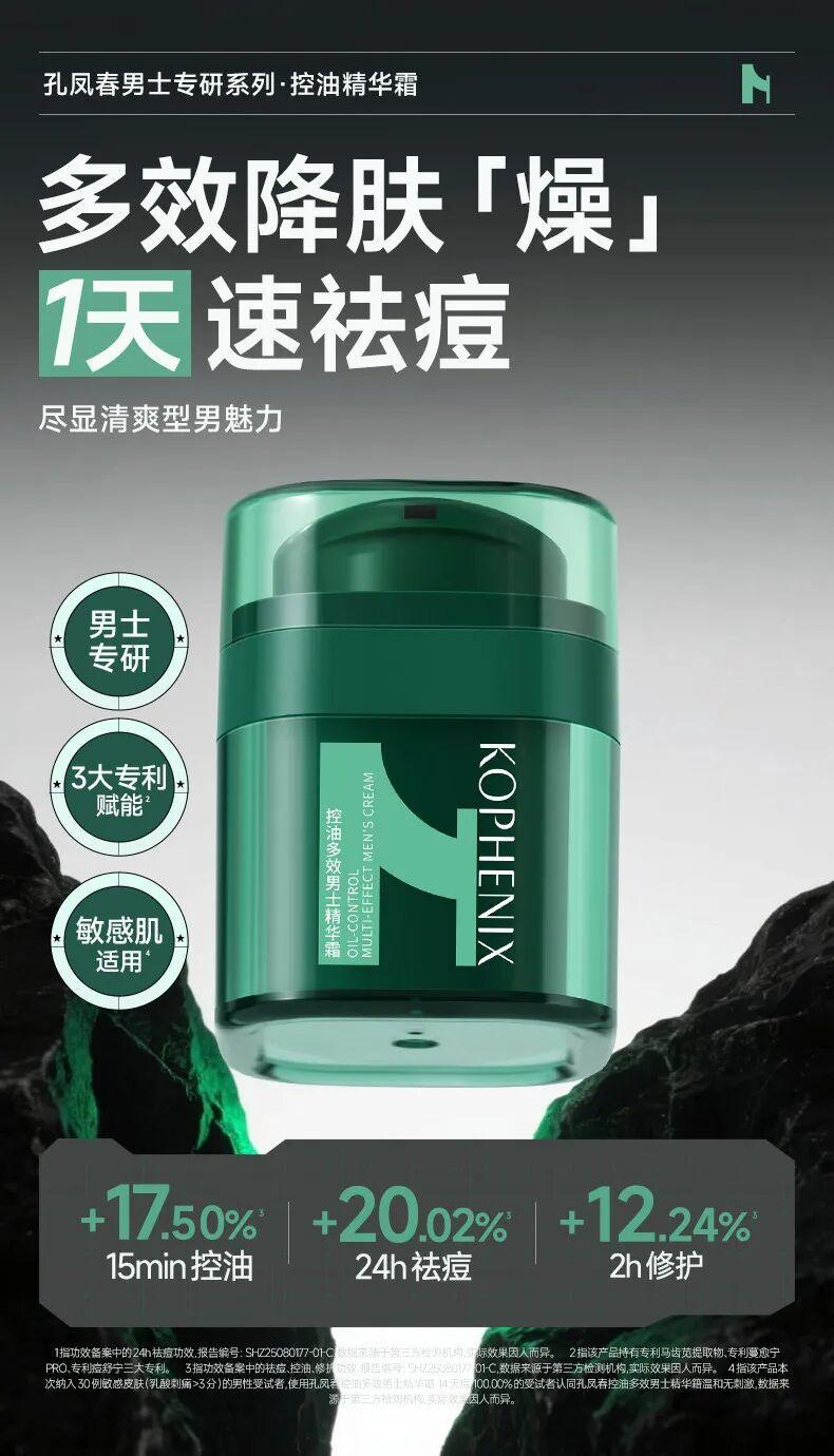 孔凤春这款男士精华霜定位油痘肌核心护理诉求,主打无酸温和调理与精简多效护肤。