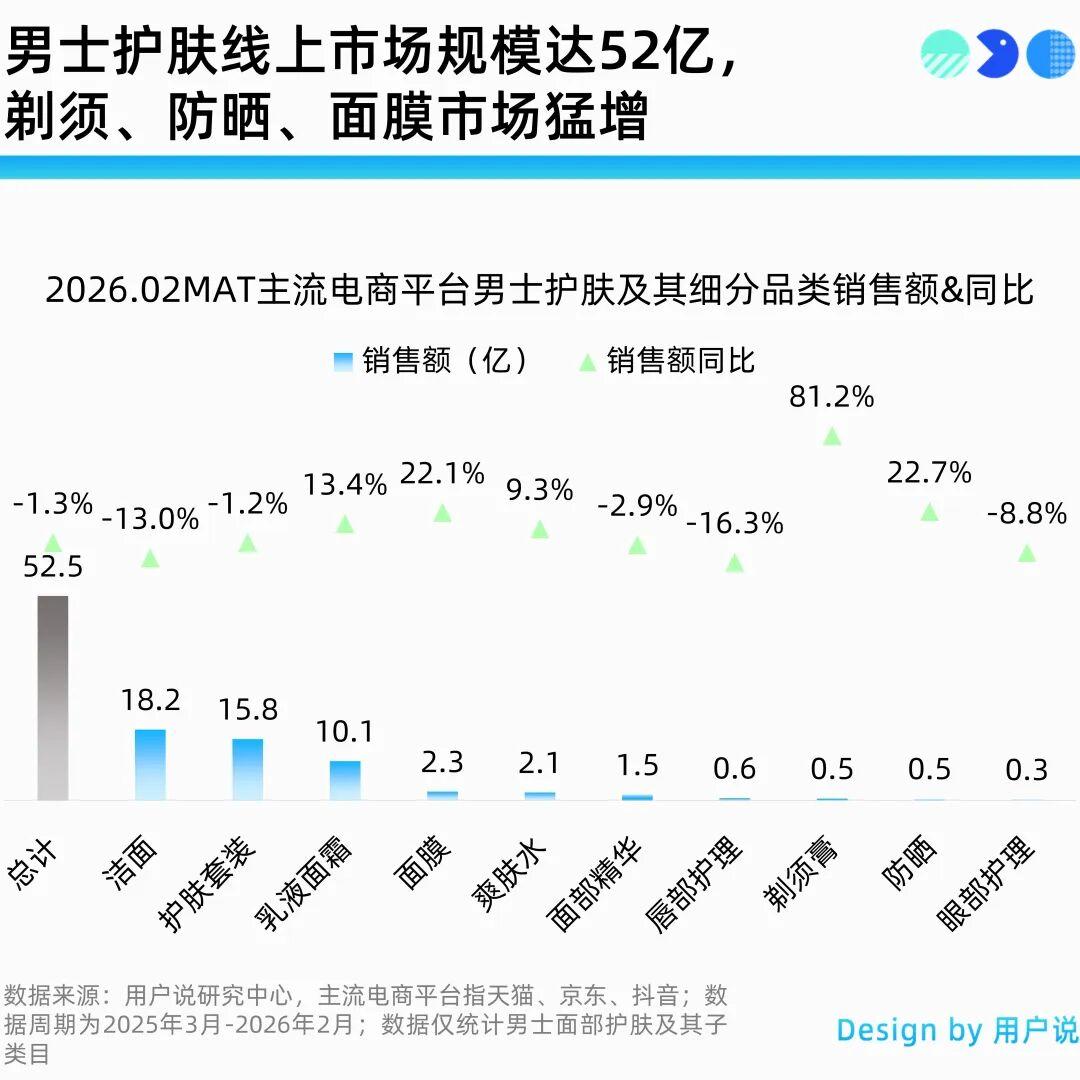 据用户说研究中心数据,2025年3月至2026年2月男士护肤线上市场规模达52.5亿元,其中剃须、防晒、面膜市场猛增。同样保持增长态势的品类包括乳液面霜和爽肤水,乳液面霜在主流电商平台的销售额为10.1亿元,同比增长13.4%;爽肤水销售额为2.1亿元,同比增长9.3%。