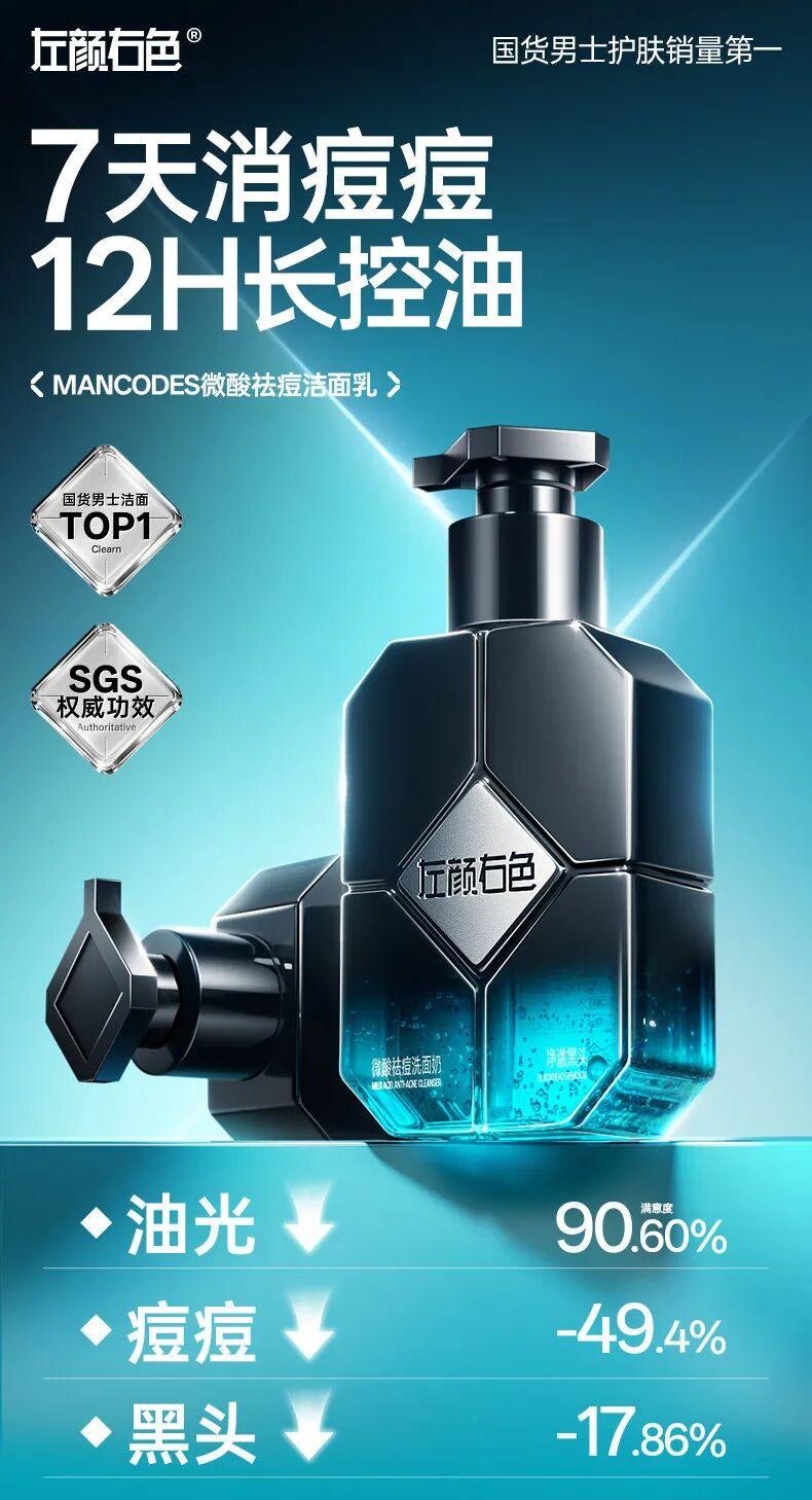 核心优势:男士油痘肌专研,敏肌适用,8小时快祛痘,7天改善成片痘,14天平滑淡印