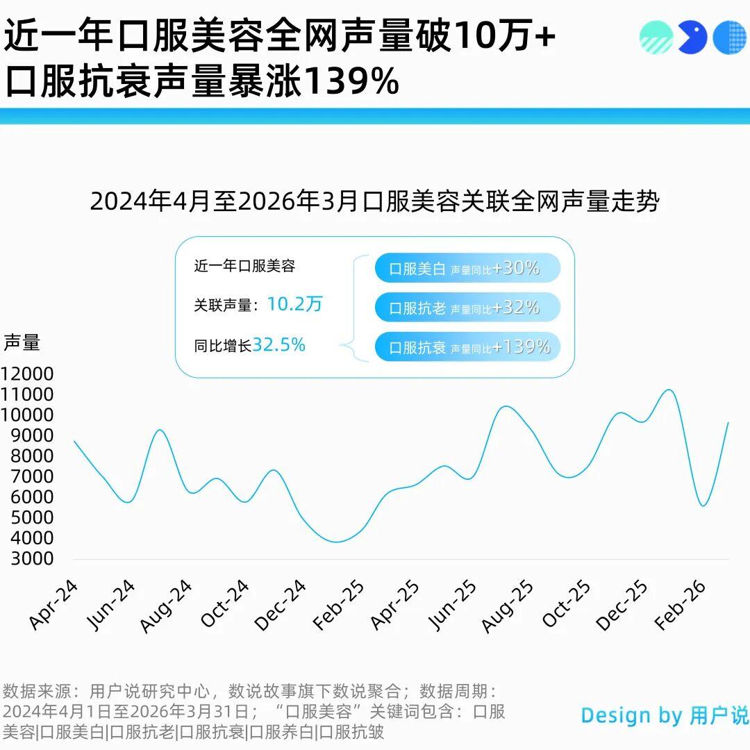 声量也反映了消费者对口服美容的热情居高不下,用户说研究中心数据显示,近一年口服美容全网声量达10.2万,同比飙升32.5%。其中,口服美白增长30%,口服抗老增长32%,而口服抗衰更是暴涨139%。