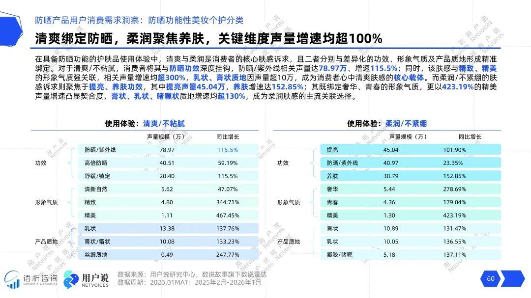 用户对核心肤感的描述,已自然分化出两套泾渭分明的联想体系。追求“清爽/不粘腻”的体验时,用户首要关联的是防晒功效本身(相关声量78.97万,增长115.5%),并同步期待产品能塑造精致、精美的形象气质(相关声量增速超300%)。乳、膏状质地是承载此需求的首选。