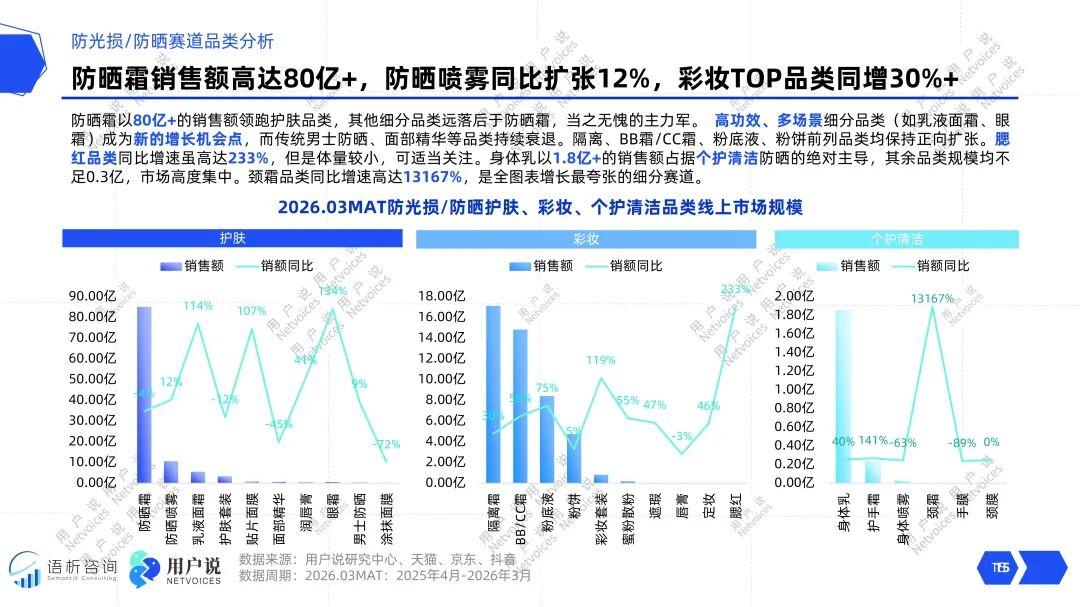 个护清洁板块则呈现高度集中与极端增长并存的局面:身体乳占据绝对主导,但颈霜品类高达13167%的高涨增速,如同一个强烈的信号,预示着身体局部精细化防晒护理需求可能正在觉醒,尽管基数极小,但指向性明确。