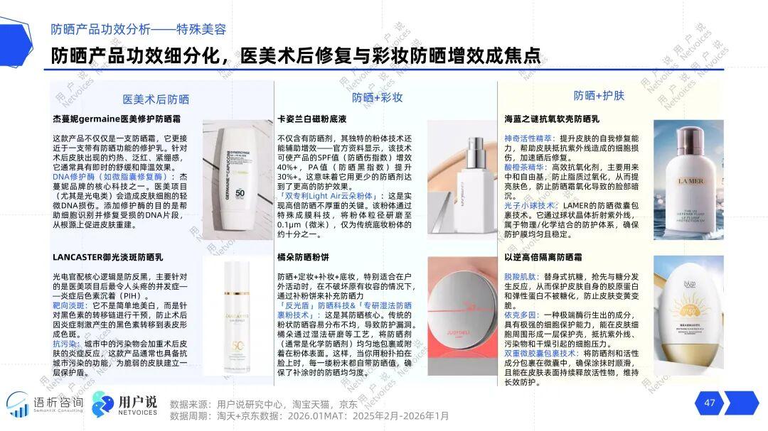 防晒产品的功效创新正沿着两条高附加值路径纵深发展。第一条是需求专业化,以医美术后修复型防晒为代表。这类产品如杰蔓妮、LANCASTER,其核心逻辑已超越基础防晒,上升至“防反黑、促修复”的术后专业护理。它们通过添加DNA修护酶、靶向淡斑成分等,精准解决用户在做完光电项目后最担忧的炎症色沉问题,定价和附加值也相应提升。