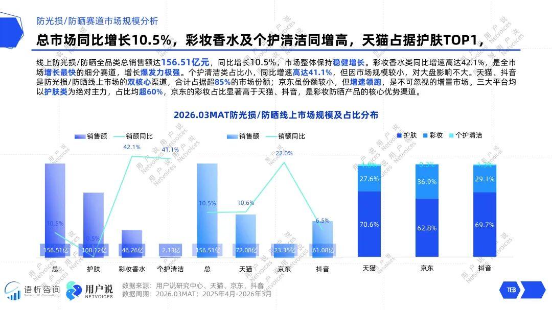 最引人瞩目的爆发点来自彩妆香水赛道,其同比增速高达42.1%。这强烈预示防晒需求正从单纯的护肤步骤,强势渗透至日常妆备环节,“妆防一体化”成为核心增长引擎。