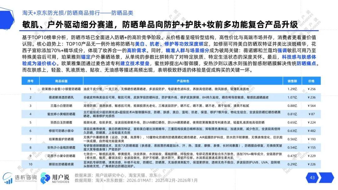 人群破圈与细分市场崛起,除传统油性肌肤人群外,针对敏感肌、橄榄皮、母婴家庭及“早八通勤族”的细分赛道正在以倍数级声量增长。破圈的关键在于超越防晒本身,深入地解决特定人群在具体生活场景中的复合痛点。