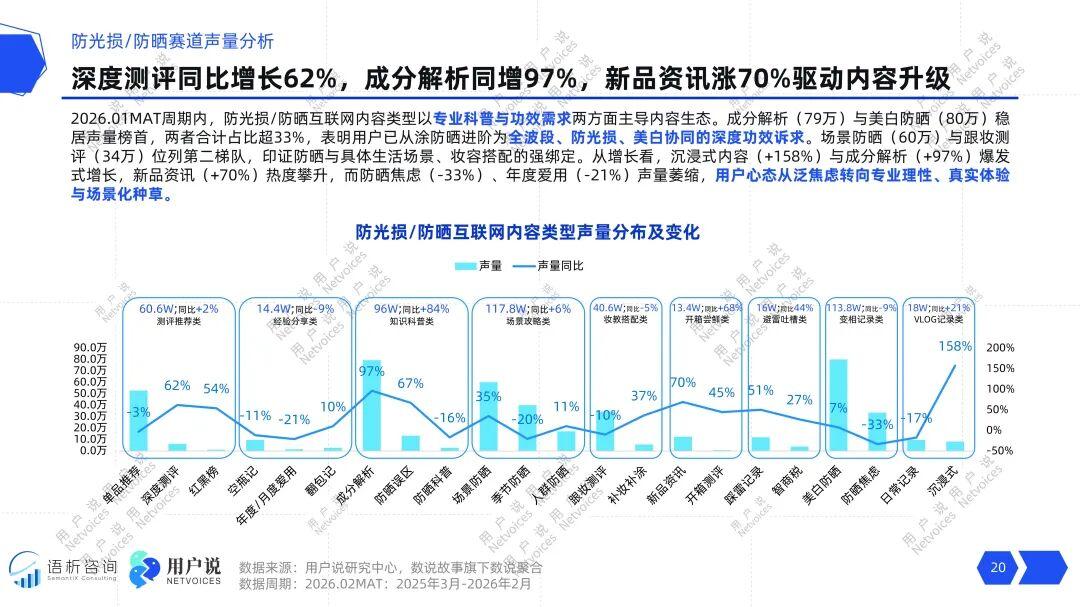 用户关于防晒的讨论,其内核正经历一场深刻转向。单纯制造防晒焦虑的内容声量正在萎缩,同比下降33%,而年度爱用这类宽泛分享也减少了21%。这宣告了恐吓式营销与流水账分享的效力正在减退。用户的注意力与信任,正快速流向专业与深度。成分解析声量同比增长97%,沉浸式测评内容暴涨158%,新品资讯增长70%。