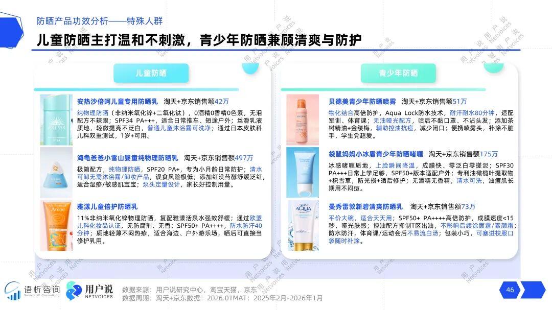 尽管目前销售额头部产品如海龟爸爸小雪山(497万)的体量无法与大众市场爆款相比,但其高达42.1%的品类增速预示了巨大潜力。这个赛道的壁垒恰恰在于其特殊,新品牌入局需在配方安全、权威背书和亲子沟通上建立深厚信任,一旦建立,用户忠诚度极高。青少年防晒则更侧重场景适配(如军训、体育课)和体验痛点解决(如控油抗痘、便携补涂),贝德美、袋鼠妈妈等产品已做出参考示范。