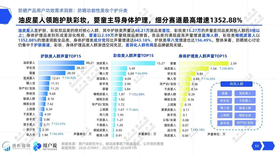 然而,真正的增长黑马隐藏在细分赛道。在彩妆类,“橄榄皮星人”的声量增速高达1352.88%,这个对底妆色号、防晒是否泛白极为敏感的群体,正在迫切寻求专属解决的方案。在身体护理类,“成分党”人群的声量增速达到643.18%,他们不满足于普通护理,追求成分配方。同时,护肤类的“早八党”(增速156.49%)也值得关注。