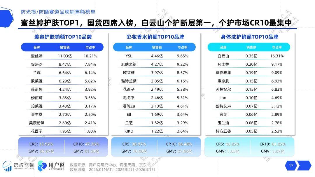 当前市场品牌竞争呈现分散中有集中的特点。护肤线,蜜丝婷以超10%的市占率领先,但TOP10品牌集中度(CR10)不足50%,市场仍相对分散,为新锐品牌留下了竞争空间。彩妆线头部效应更明显,YSL、肌肤之钥等高端品牌领跑,CR10接近60%,门槛已初步形成。