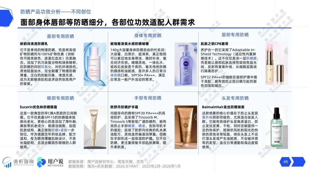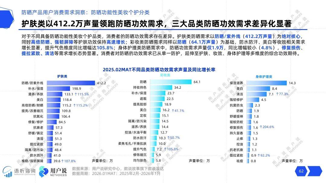 身体护理品类则呈现基数小、潜力大的特点,其“修复损伤”需求增速超过1200%,“提拉紧致”等诉求也增长显著。这表明,身体防晒的叙事逻辑亟待转向“针对性解决身体肌肤的特有光老化问题”。