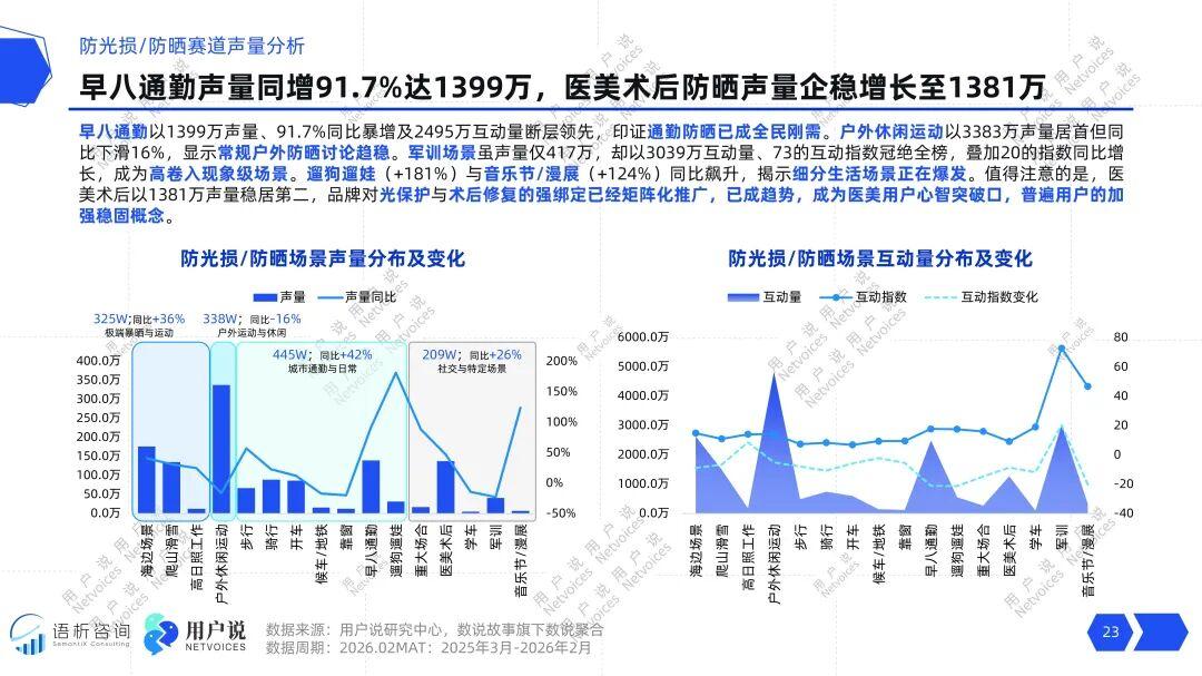 真正的价值洼地出现在两类场景,一是全民性、高频次的超级场景,如早八通勤,其声量同比增长91.7%至1399万,互动量高达2495万,证明通勤防晒已成为拥有巨大共识和讨论热度的日常必备程序。二是高卷入、强情绪的沸点场景,以军训为典型,其声量仅417万,但互动量高达3039万,互动指数73位居榜首。